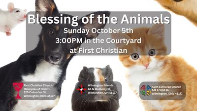 The congregations of Faith Lutheran Church, Wilmington Friends Meeting, and First Christian Church will gather together in the courtyard of First Christian Church for the Blessing of the Animals.